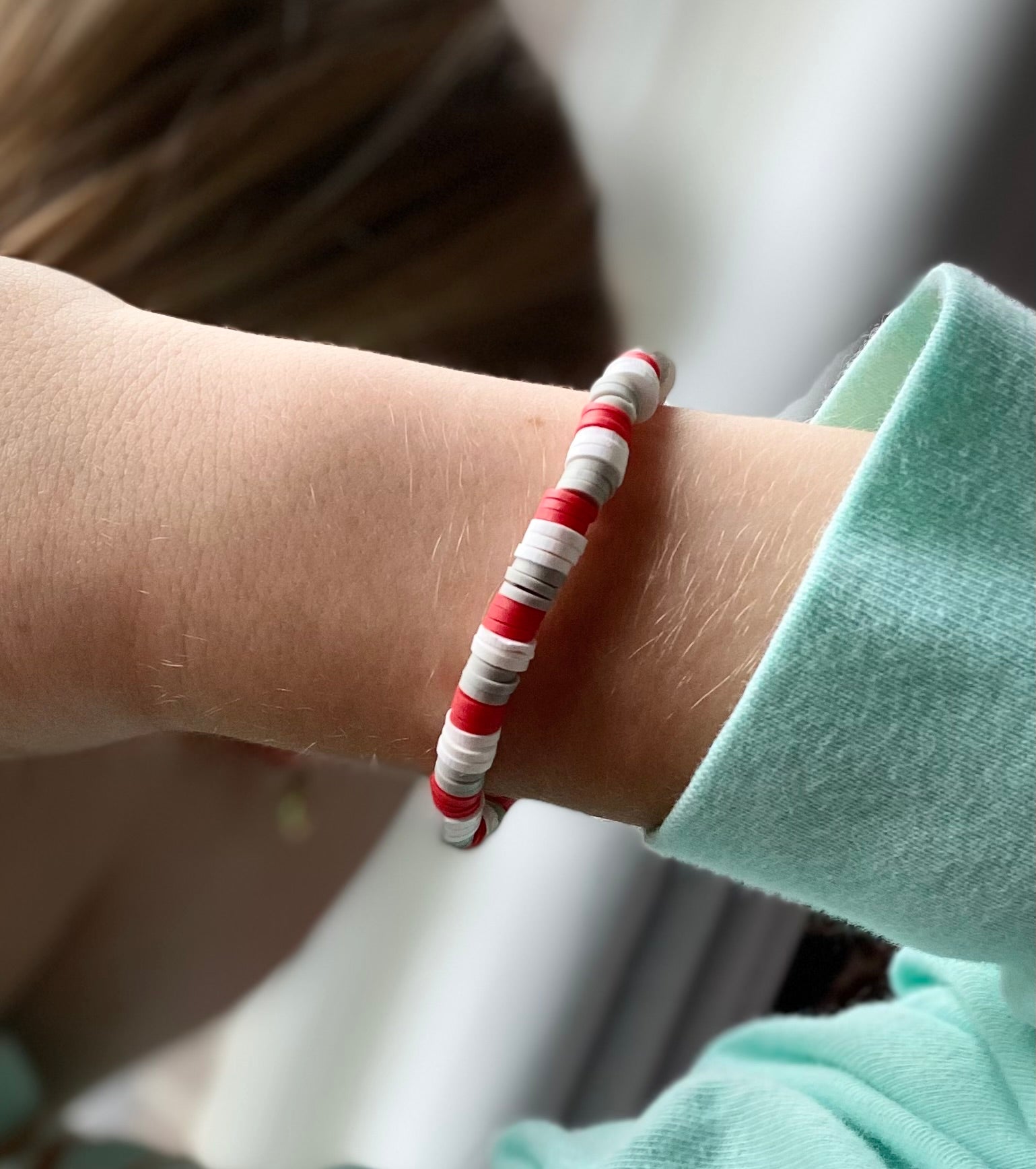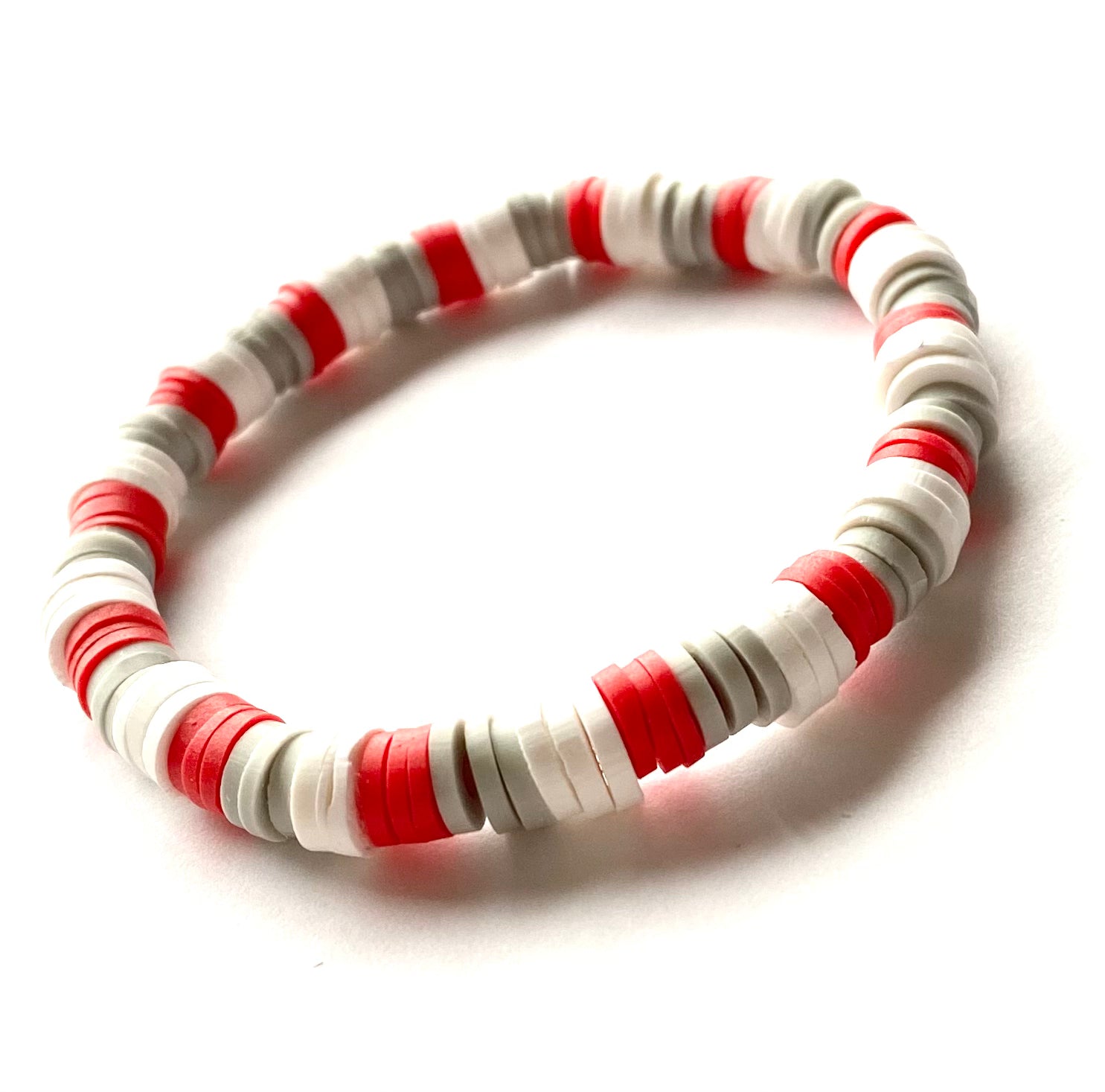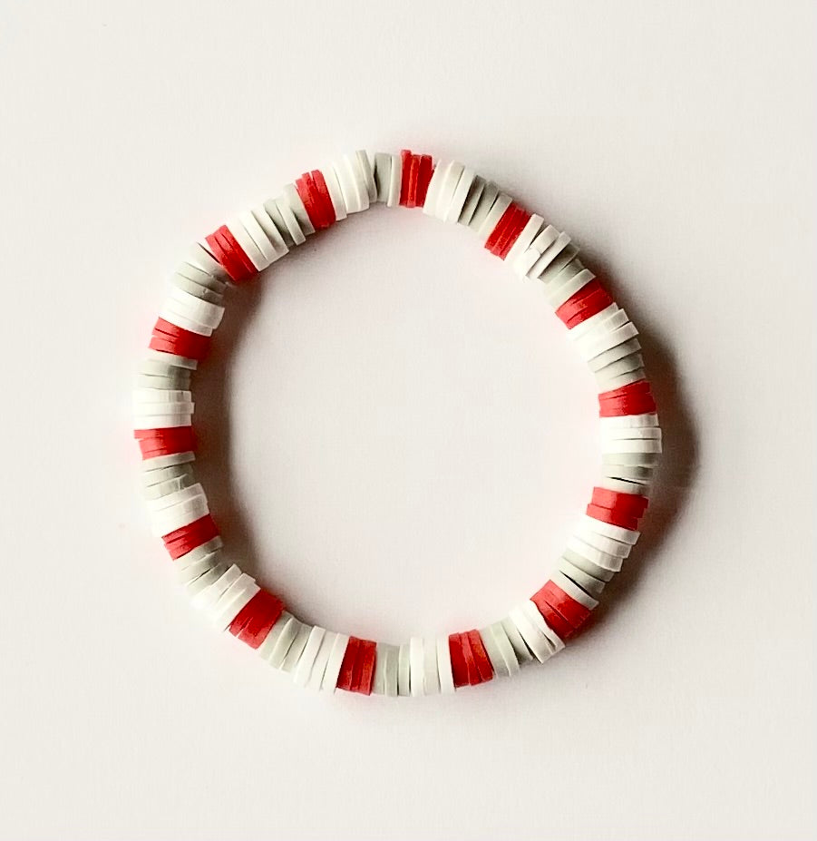 Strung on stretchy clear string, this bracelet brings an energizing pop of color into a pattern of gray and white clay beads.